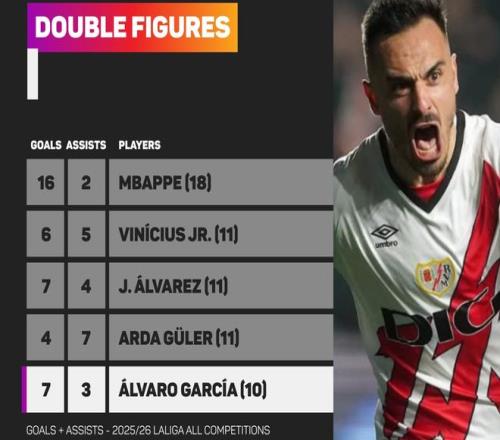 新赛季以来,加西亚为巴列卡诺在西甲9轮比赛中打入3球,贡献1次助攻;欧协联附加赛+正赛4场比赛中贡献了4球2助攻。