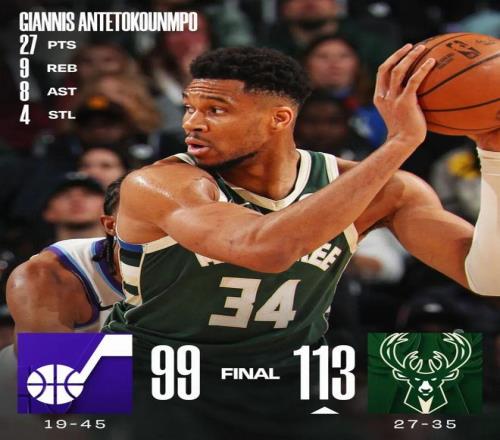 常规赛,雄鹿主场113-99战胜爵士。